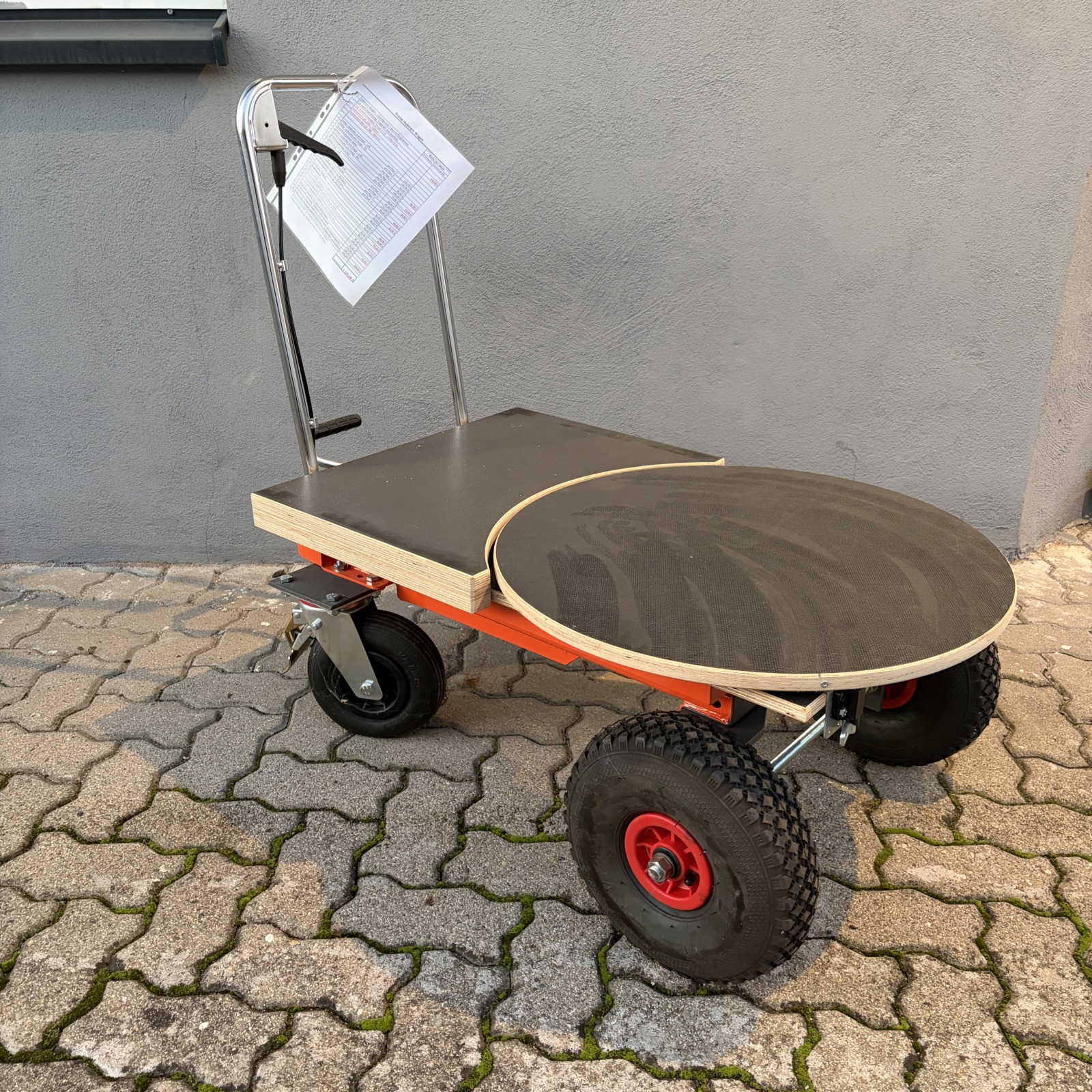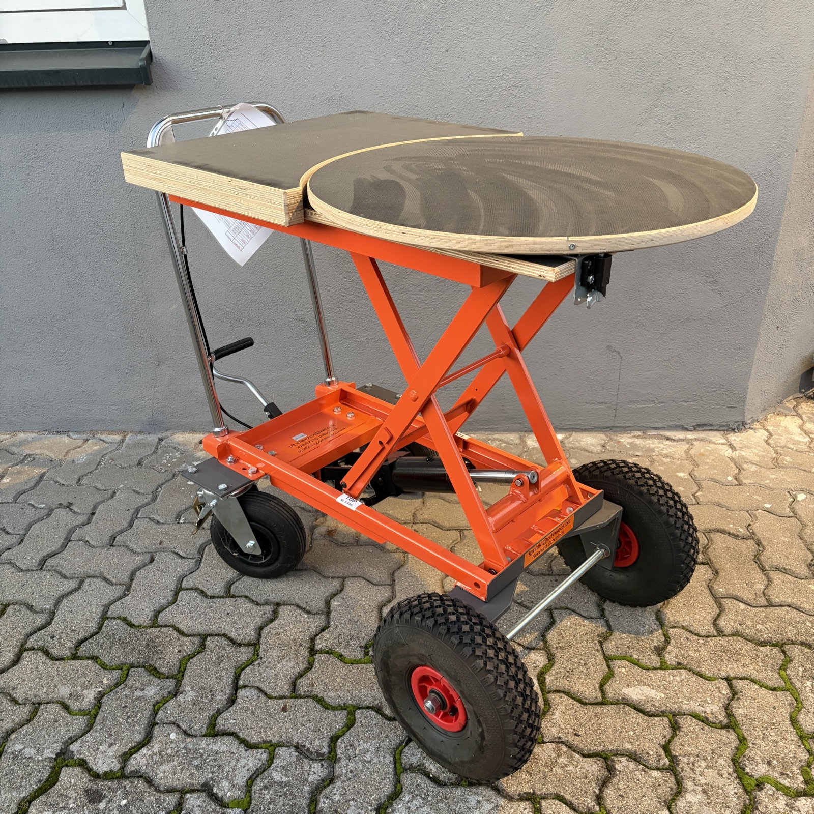 Hubwagen "Ferrari" TF23 mit 230kg Tragkraft in Vollausstattung. (Die "Ferrari" Serie habe ich zusammen mit Mugo (Enzo) Ferrari entworfen) Die runde Arbeitsplatte hat einen Durchmesser von ca. 58cm und ist 3-Fach feststellbar. Durch die extra Platte, die einfach nur aufgelegt wird, kann die Ebene Arbeitsfläche bis auf ca. 92cm verlängert werden. Zum Reinigen ist es aber sinnvoll, diese ohne schnick schnack wieder entfernen können! Lenkrollen 225mm - Luft Starre Räder vorne: 300mm Luft Die maximale Höhe des Tisches beträgt 88cm Die minimale Höhe beträgt 38cm! Versand nur mit Spedition, wegen dem Gewicht des Hubwagens - Kosten für Spedition Innerhalb "D" ca. 100,- Euro Aufpreis! Selbstabholung und/oder Übergabe auf einer Ausstellung ist aber kein Problem!